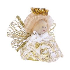 Bell Angel, White and Gold Tone Lace Dress, White Ribbon Bow, Christmas Ornament listed in: