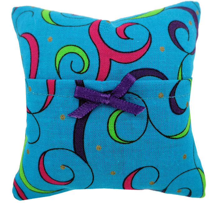 Turquoise tooth fairy pillow with swirl print fabric for girls with a pocket on the front for your child's lost tooth and for the tooth fairy to leave a surprise. The pillow makes it easier for the tooth fairy to find the lost tooth.